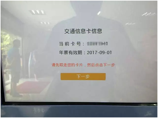 取走交通信息卡,然后点击下一步 按照屏幕提示:将通渝卡放置在感应区域